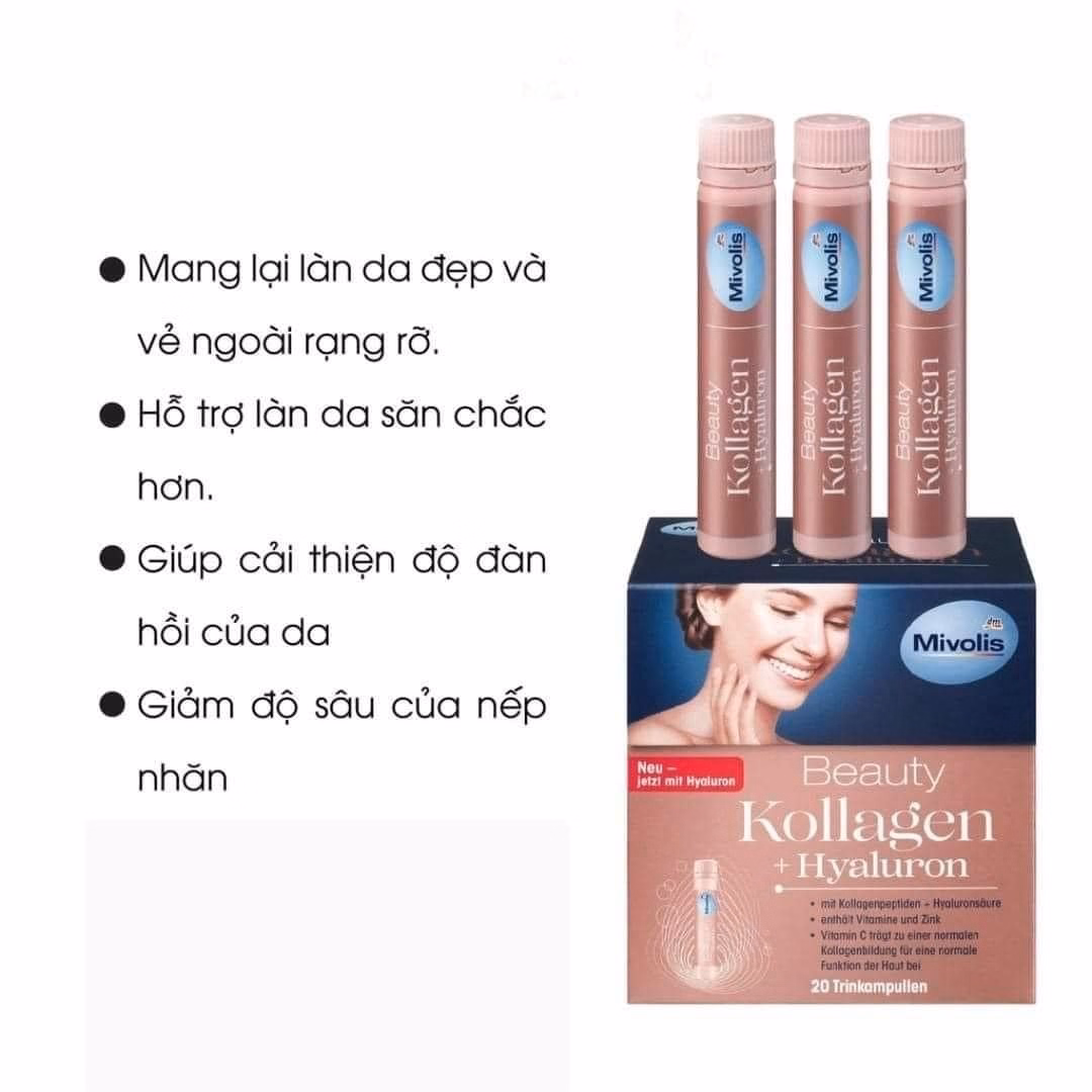 Nước uống đẹp da Kollagen Mivolis là thức uống làm đẹp được ưa chuộng trên thị trường hiện nay. Với thành phần chính là collagen giúp cải thiện độ đàn hồi cho da, giảm nếp nhăn, nếp gấp, hạn chế lão hóa giúp da mịn màng căng bóng, bên cạnh đó nước uống cũng giúp dưỡng trắng da, ngăn chặn sự xuất hiện của sắc tố melanin.