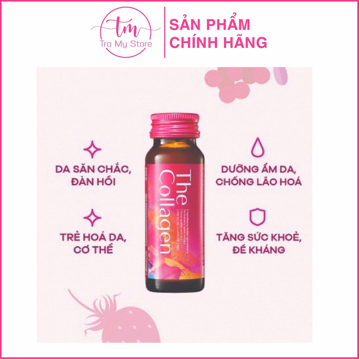 – Hàm lượng thành phần có trong 1 chai: Collagen (1000mg), Hyaluronic Acid (5mg), Vitamin C (100mg), Ceramide (600mg).