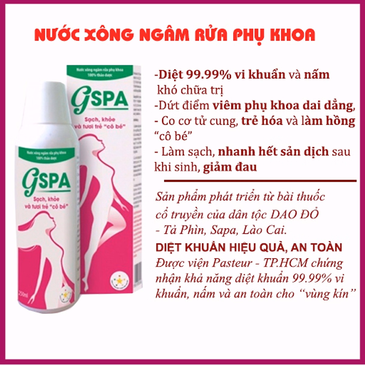 Nước xông ngâm rửa phụ khoa Gspa – Sạch, khỏe và tươi trẻ ”Cô bé”. Thảo dược thiên nhiên được phát triển từ bài thuốc tắm cổ truyền của người Dao đỏ Tả Phìn. Nước xông ngâm rửa phụ khoa gspa có tác dụng phòng và ngăn ngừa các chứng viêm, nhiễm phụ khoa: Tử cung co hồi không tốt, máu xấu không ra, huyết ứ trướng đau, kết hòn cục đau bụng, rong huyết; Giúp làm sạch, giảm đau, co cơ tử cung, nhanh hết sản dịch, khử mùi hôi tanh; Ngăn ngừa thâm đen, nhiễm trùng và nhiễm trùng ngược dòng.