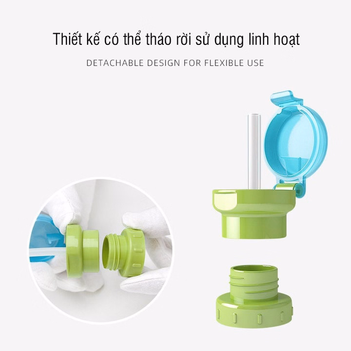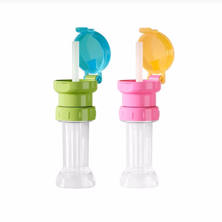 Nắp được thiết kế độc đáo khi có thể gắn vào chai nước như lavie, pepsi… tiện lợi cho những bé vẫn chưa quen với việc uống trực tiếp trong chai.