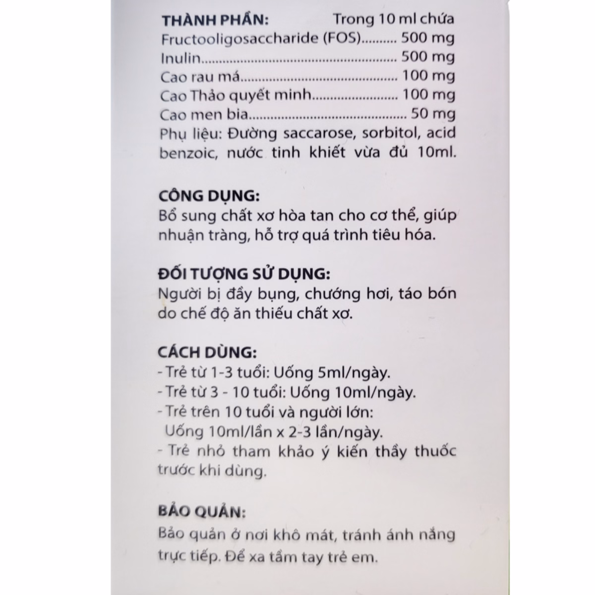 Mỗi ống 10ml có chứa Fos 500mg, Inulin 500mg, Cao rau má 100mg, Cao Thảo quyết minh 100mg, Cao men bia 50mg