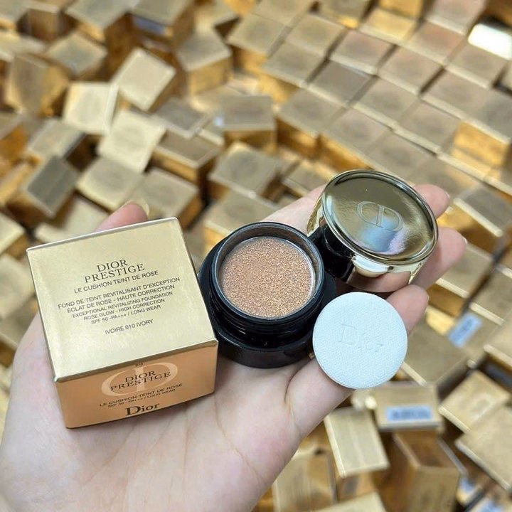 Phấn nước Dior Prestige Cushion 4g mini. Vỏ hộp sang trọng, xa xỉ là sự kết hợp giữa sức mạnh giúp hồi sinh làn da rạng rỡ từ 500 cánh hoa hồng với sự hoàn hảo trong công nghệ makeup tân tiến của một lớp nền thế hệ mới, vừa là một sản phẩm trang điểm hoàn hảo, vừa là một sản phẩm dưỡng da hằng ngày giúp ngăn ngừa sự già hoá, dưỡng da căng bóng và đều màu hơn sau mỗi lần sử dụng.