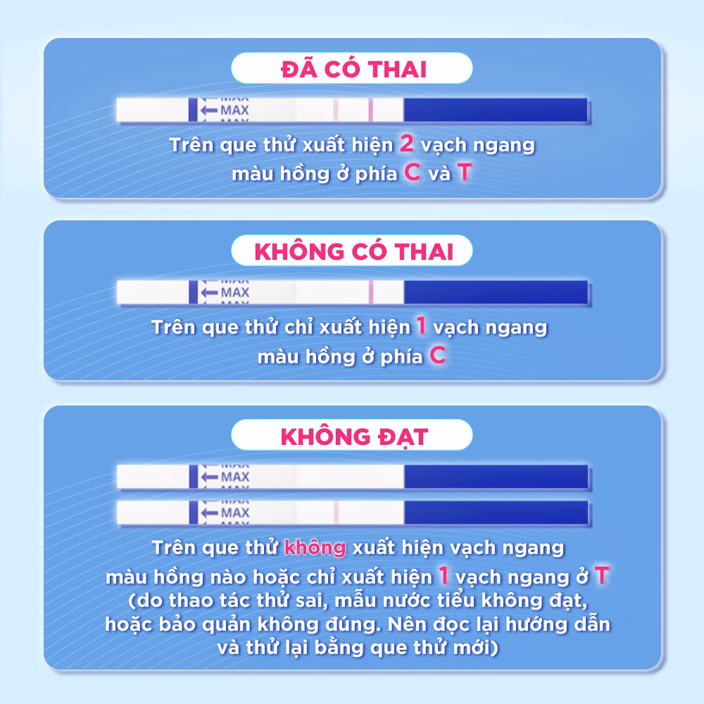 – Không Đạt: Trên que thử không xuất hiện vạch ngang màu hồng nào hoặc chỉ xuất hiện vạch ngan ở T (do thao tác thử sai, mẫu nước tiểu không đạt, hoặc bảo quản không đúng. Nên đọc lại hướng dẫn và thử lại bằng que thử mới.
