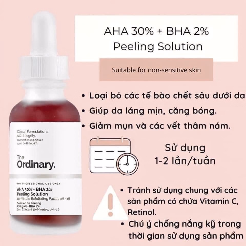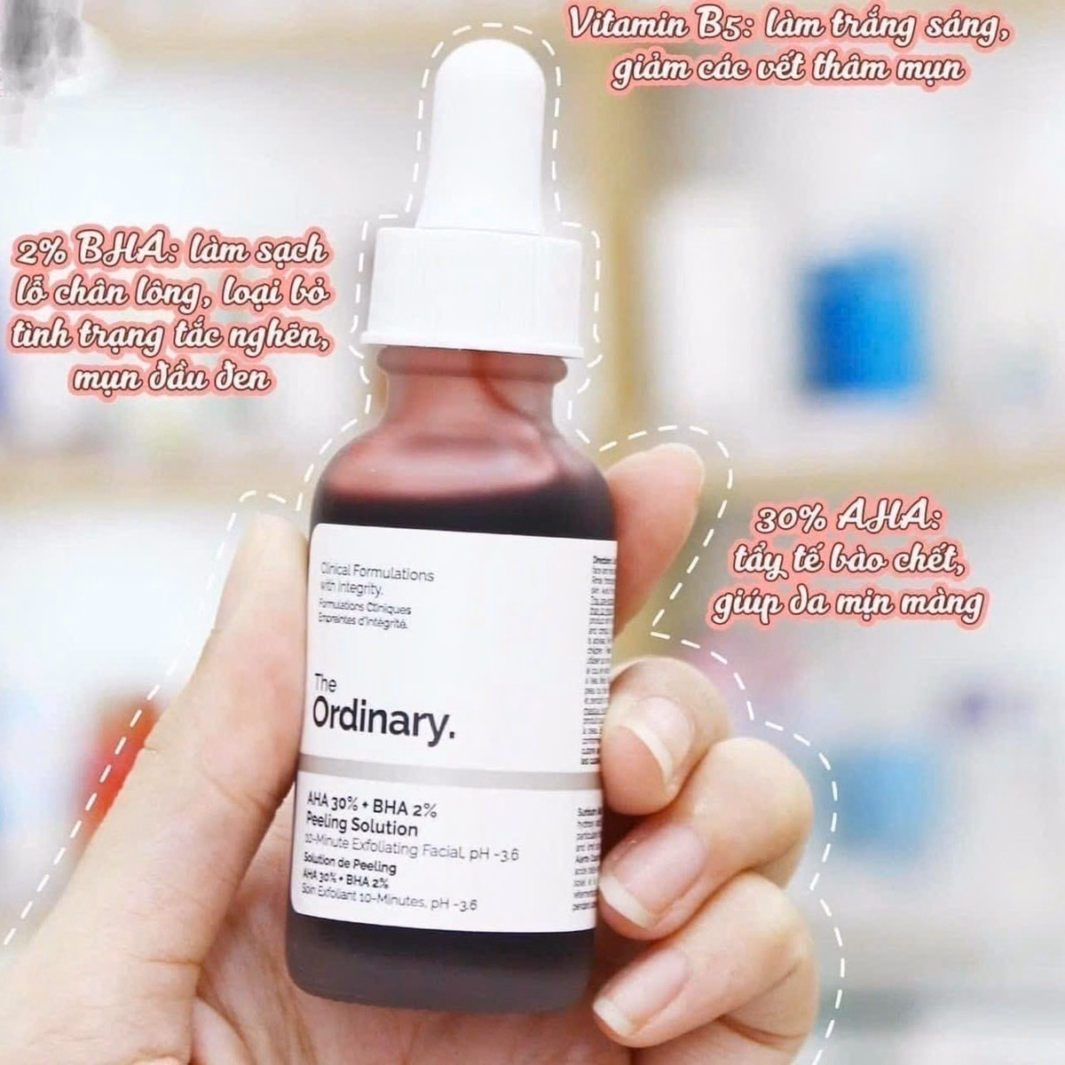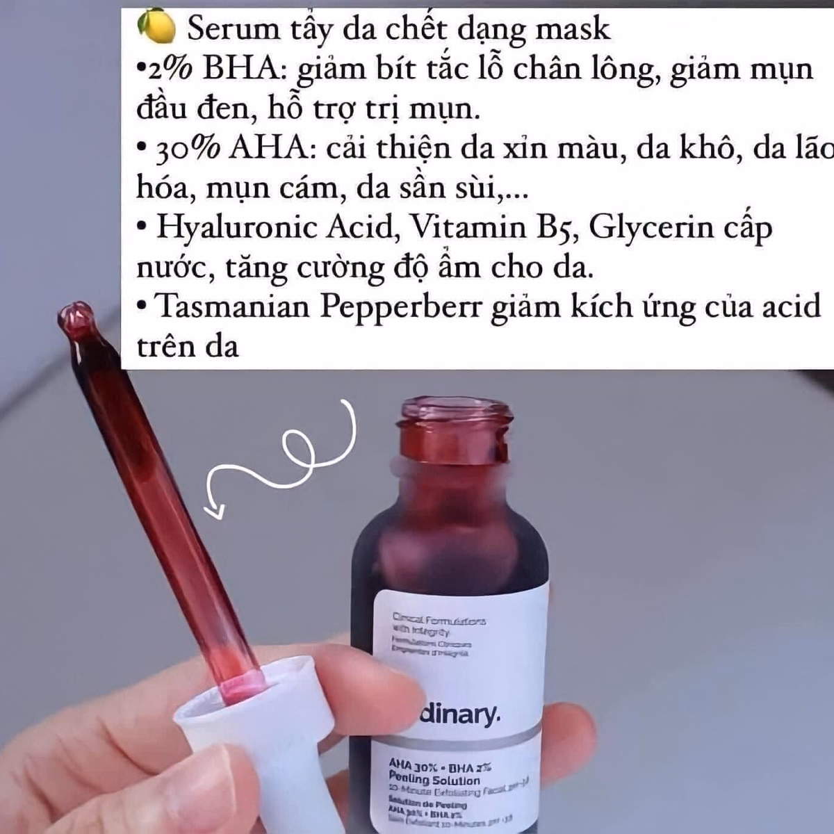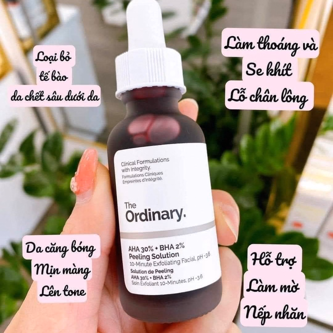 The Ordinary Aha 30% + Bha 2% Peeling Solution là 1 dạng của tẩy tế bào chết nhưng chuyên sâu hơn những loại tẩy tế bào chết hóa học với nồng độ thấp, chứa chiết xuất thảo dược từ cây đàn Tasmania kết hợp với 2% Bha, 30% Aha (Glycolic, Lactic, Citrid, Tartaric acid), Hyaluronic acid, Vitamin B5, Glycerin, Black Carrot,… giúp kích thích thông thoáng và giảm tình trạng tắt nghẽn lỗ chân lông, hỗ trợ trị mụn và thâm mụn, loại bỏ lớp sừng già cỗi, cải thiện bề mặt da, tăng cường độ ẩm, chống oxy hóa, giảm kích ứng, tái tạo tế bào da mới, dưỡng da căng mịn và đều màu,…