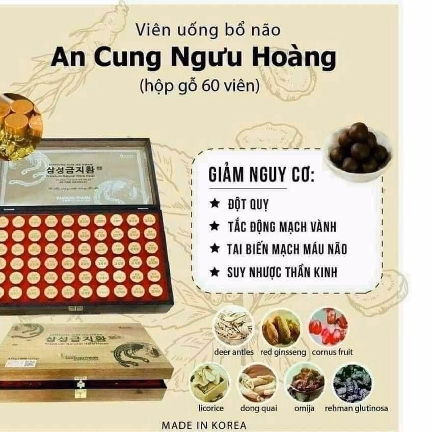 An cung ngưu hoàng hoàn Hàn Quốc hộp gỗ 60 viên còn hỗ trợ phòng chống các bệnh về cao huyết áp và tai biến mạch máu não, tim đập nhanh, ích khí dưỡng huyết trấn kinh an thần, hỗ trợ trị phong cũng như cho các bệnh do khí huyết không đỏ, hỏa khí trong người vượng, đờm nhiệt gây nên tức ngực khó thở nhức đầu hoa mắt đi lại nói năng khó khăn, đầu óc không tỉnh táo.