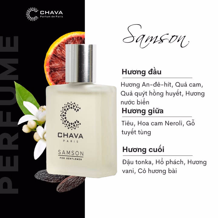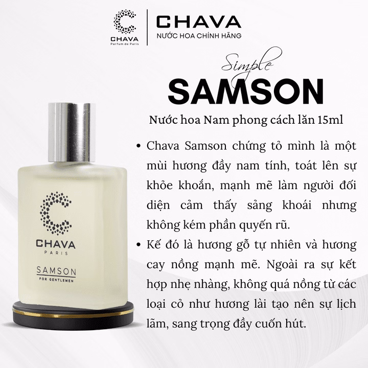 Chava Samson chứng tỏ mình là một mùi hương đầy nam tính, toát lên sự khỏe khoắn mạnh mẽ làm người đối diện thấy sảng khoái nhưng không kém phần quyến rũ.