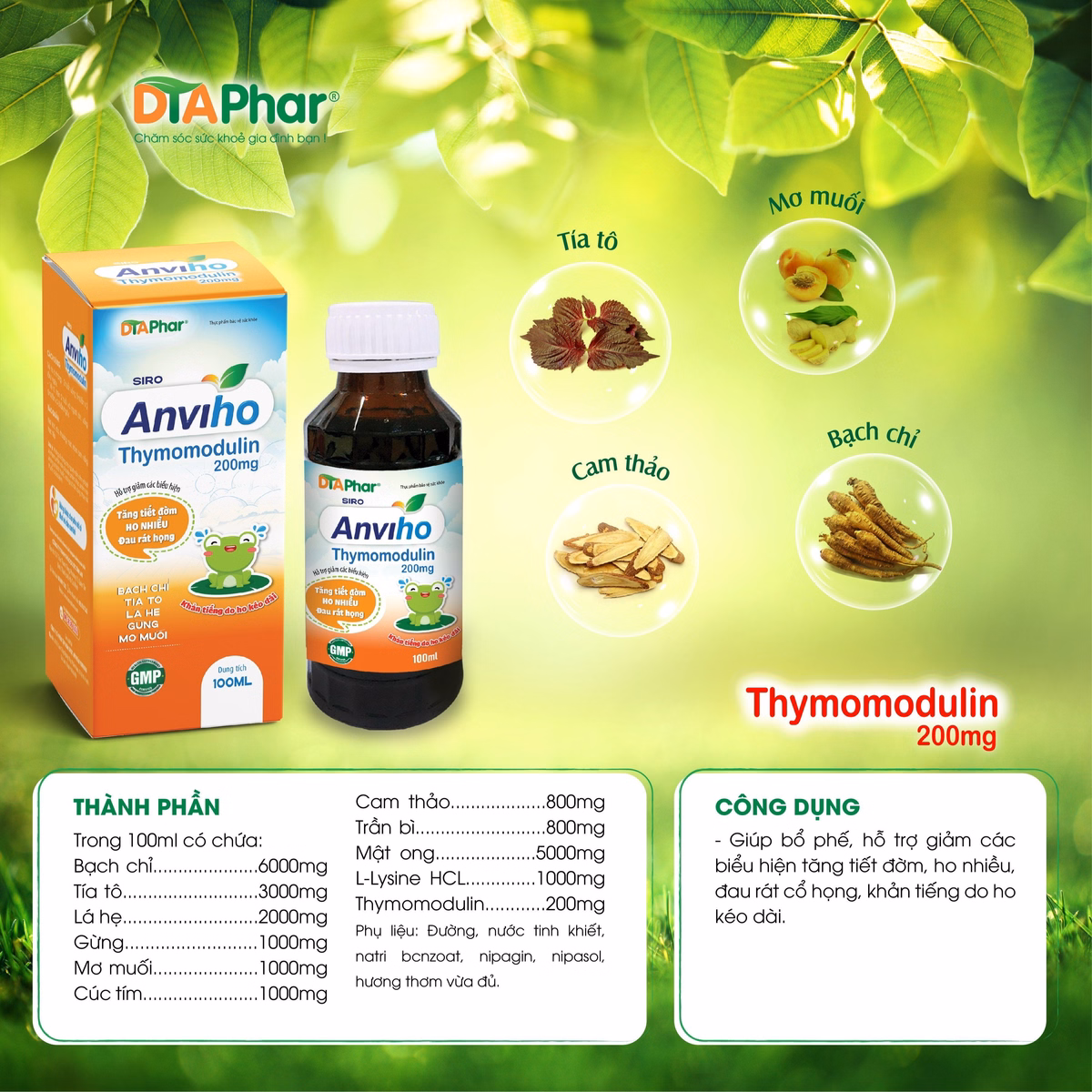 Thành phần: Bạch chỉ, tía tô, lá hẹ, gừng, mơ muối, cúc tím, cam thảo, trần bì, mật ong, Lysine, Thymomoduline