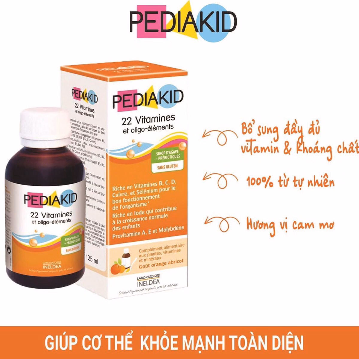 Pediakid 22 Vitamines: Bổ sung 22 vitamines và các khoáng chất cần thiết giúp trẻ phát triển cân bằng và bền vững.