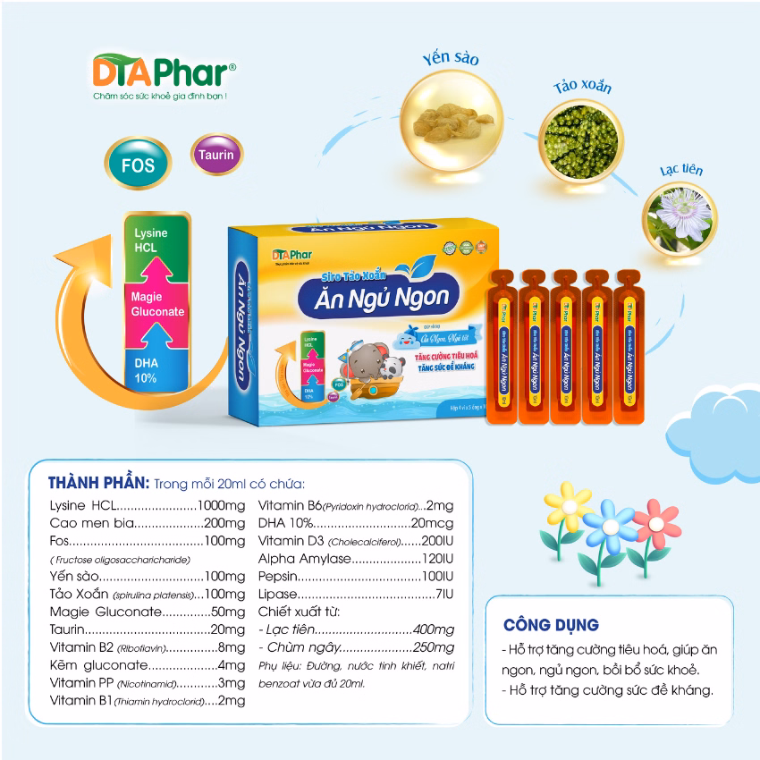 Thành phần: Lysine Hcl, cao men bia, Fos, yến sào, tảo xoắn, Magie Gluconate, Taurin, Vitamin B2, kẽm gluconate, Vitamin Pp, Vitamin B1 (Thiamin hydroclorid), Vitamin B6, Dha 10%, Vitamin D3 (Cholecalciferol), Alpha Amylase, Pepsin, Lipase