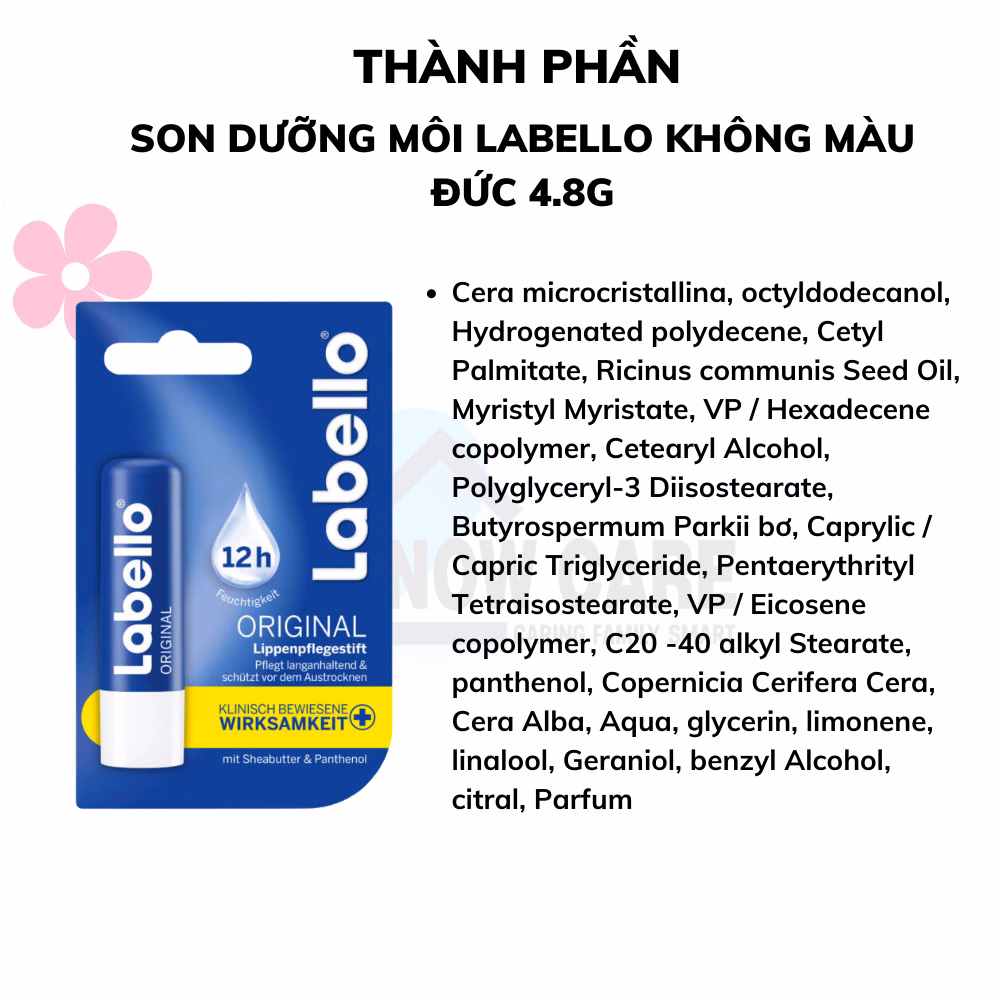 Thành phần: Cera microcristallina, octyldodecanol, Hydrogenated polydecene, Cetyl Palmitate, Ricinus communis Seed Oil, Myristyl Myristate, Vp / Hexadecene copolymer, Cetearyl Alcohol, Polyglyceryl-3 Diisostearate, Butyrospermum Parkii bơ, Caprylic / Capric Triglyceride, Pentaerythrityl Tetraisostearate, Vp / Eicosene copolymer, C20 -40 alkyl Stearate, panthenol, Copernicia Cerifera Cera, Cera Alba, Aqua, glycerin, limonene, linalool, Geraniol, benzyl Alcohol, citral, Parfum