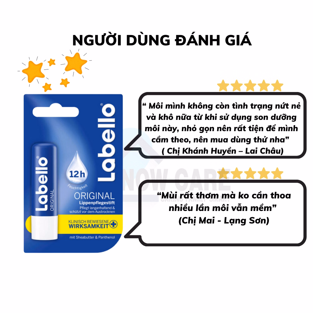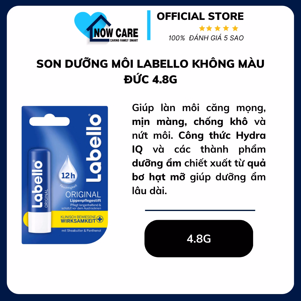 Son dưỡng môi Labello Original giúp làn môi căng mọng, mịn màng, chống khô và nứt môi. Công thức Hydra Iq và các thành phẩm dưỡng ẩm chiết xuất từ quả bơ hạt mỡ giúp dưỡng ẩm lâu dài. Lớp nhũ mỏng lấp lánh mang tới cho bạn làn môi thơm dịu, mềm mại.