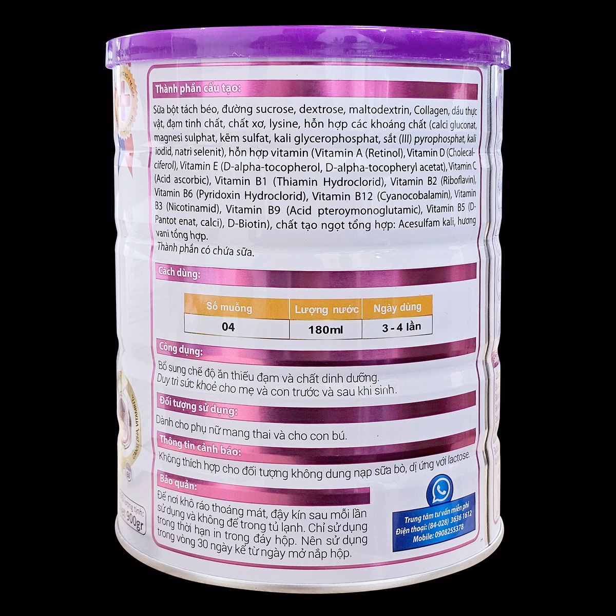 Sữa bột tách béo, đường sucrose, dextrose, maltodextrin, Collagen, dầu thực vật, đạm tinh chất, chất xơ, lysine, hỗn hợp các khoáng chất (calci gluconat, magnesi sulphat, kem sulfat, kali glycerophosphat, sắt (Iii) pyrophosphat, kali | iodid, natri selenit), hỗn hợp vitamin (Vitamin A (Retinol), Vitamin D (Cholecal- ciferol), Vitamin E (D-alpha-tocopherol, D-alpha-tocopheryl acetat), Vitamin C (Acid ascorbic), Vitamin B1 (Thiamin Hydroclorid), Vitamin B2 (Riboflavin), Vitamin B6 (Pyridoxin Hydroclorid), Vitamin B12 (Cyanocobalamin), Vitamin 83 (Nicotinamid), Vitamin B9 (Acid pteroymonoglutamic), Vitamin B5 (D- Pantot enat, calci), D-Biotin), chất tạo ngọt tổng hợp: Acesulfam kali, hương vani tổng hợp, Thành phần có chứa sữa.
