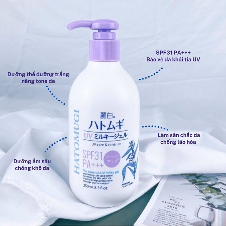 Sữa Dưỡng Thể Hatomugi The Tone Up Uv Milky Gel Uv Care & Tone Up Spf31 Pa+++ giúp dưỡng ẩm cho da mềm mịn nhờ chiết xuất Ý Dĩ. Bên cạnh đó, sản phẩm có tác dụng hiệu chỉnh sắc da và nâng tông da tự nhiên, đồng thời ngăn chặn tia Uv với chỉ số Spf31 Pa+++.