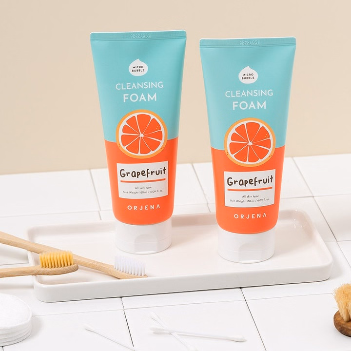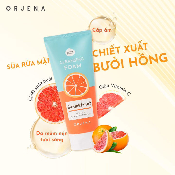 Sữa rửa mặt Orjena chiết xuất bưởi hồng giàu thành phần tự nhiên, không chứa 5 chất phụ gia (silicone, dầu khoáng, benzophenone, thành phần có nguồn gốc động vật, chất tạo màu nhân tạo).