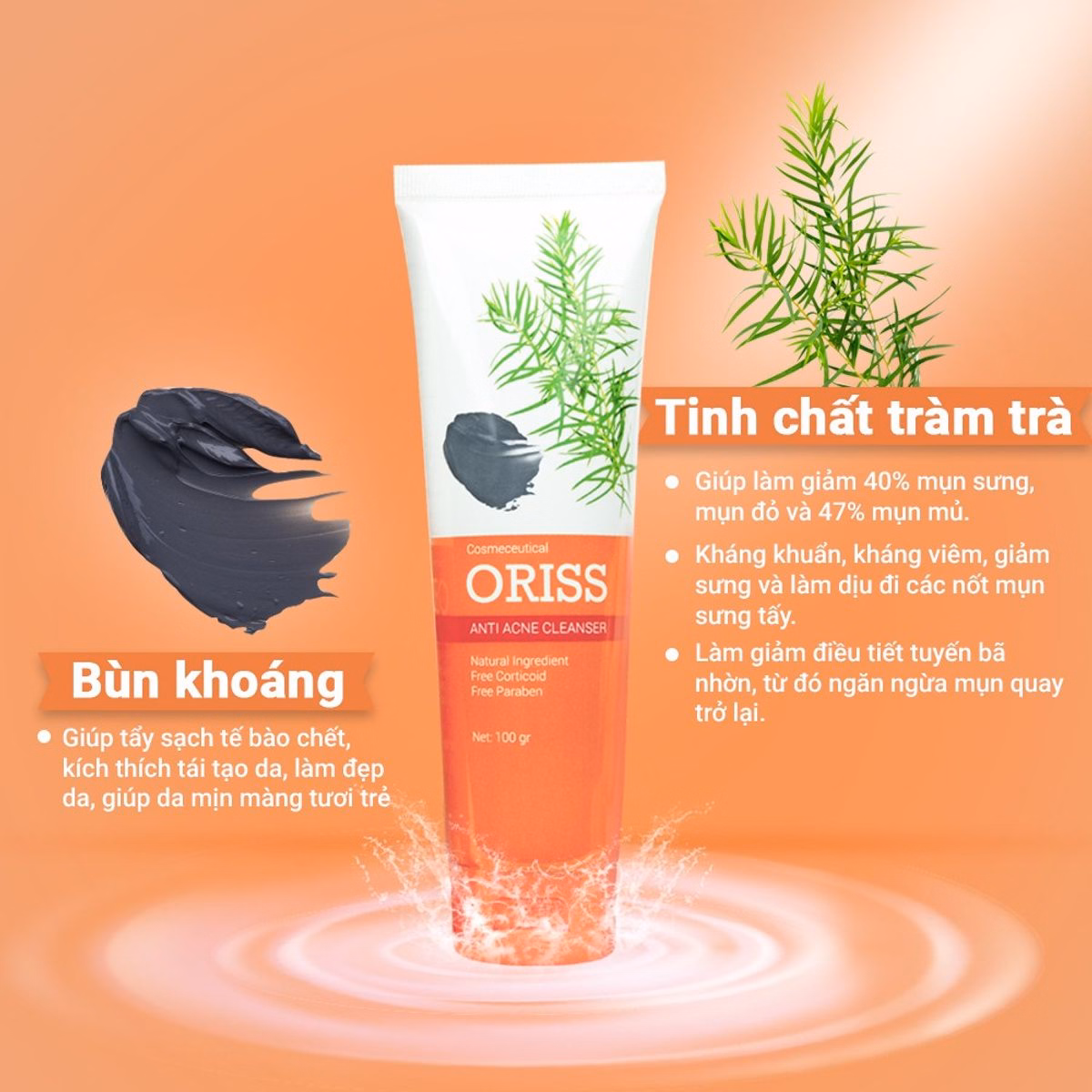 Với hai thành phần chính là bùn khoáng và tinh dầu tràm trà giúp làm sạch sâu lỗ chân lông tuyến bã nhờn bụi bẩn tích tụ nằm sâu trong da loại bỏ các vi khuẩn và các yêu tố gây mụn. Sữa rửa mặt Oriss trả lại cho bạn làn da sạch sâu thông thoáng và ngăn ngừa mụn quay trở lại.