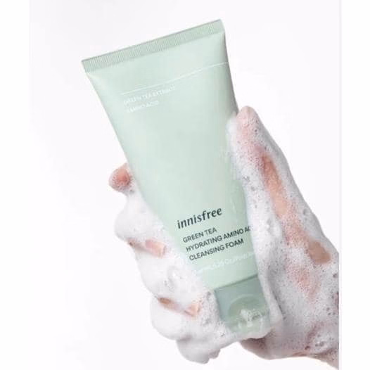 Sữa rửa mặt Innisfree Green Tea Hydrating Amino Acid Cleansing Foam cũng làm sạch da dịu nhẹ, loại bỏ các tạp chất bên trong lỗ chân lông và lớp trang điểm, đồng thời ngăn ngừa tình trạng khô da sau khi rửa mặt nhờ kết hợp rễ trà giàu saponin.