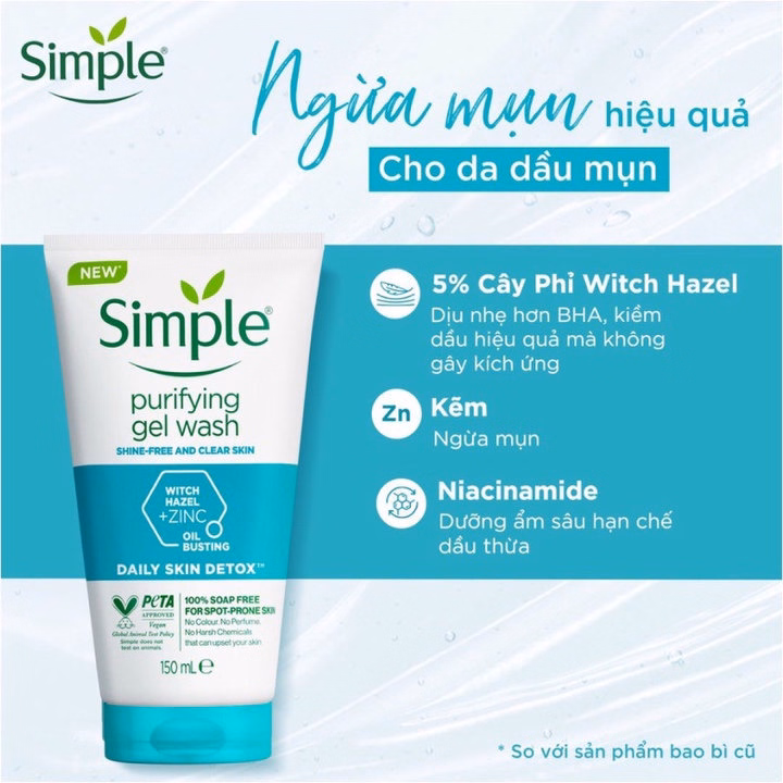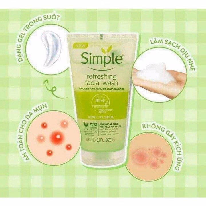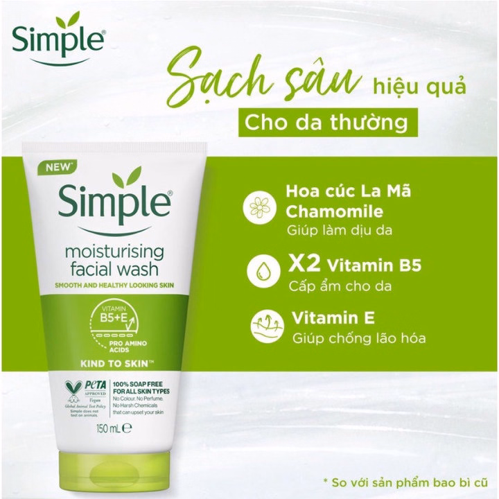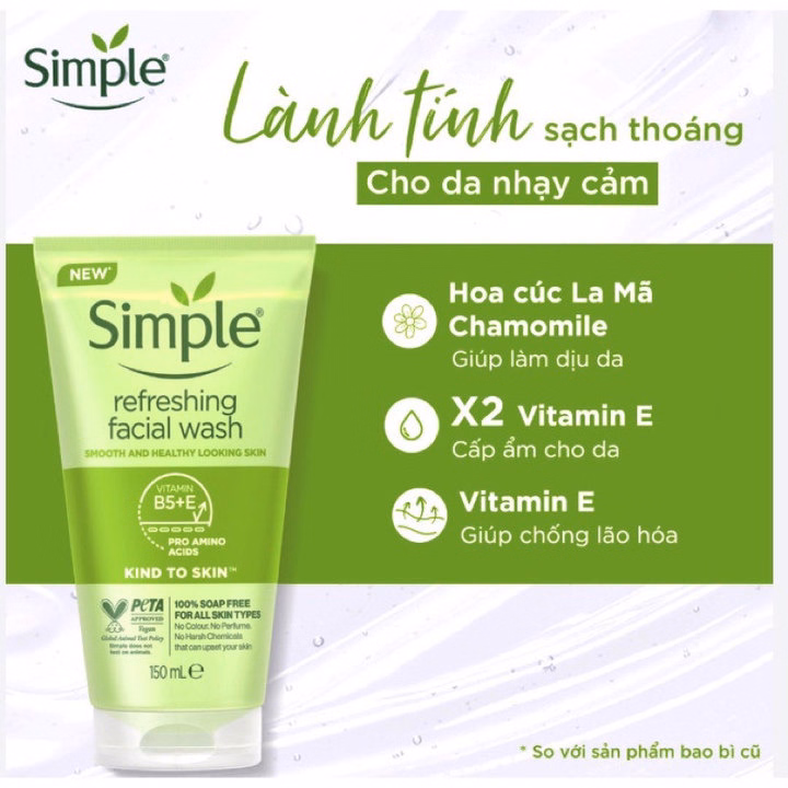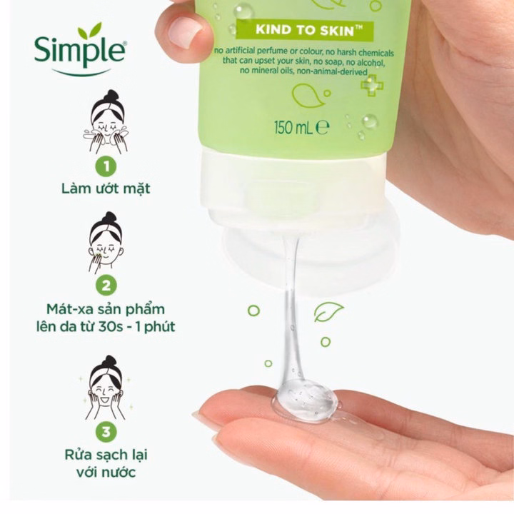 – Sữa rửa mặt Simple cho bạn một làn da ẩm, mềm mịn nhẹ dịu, sạch sâu dưới lỗ chân lông. Ngay cả với da khô, sản phẩm cũng đồng thời cung cấp nước, giữ ẩm giúp da luôn căng bóng, tươi hồng.