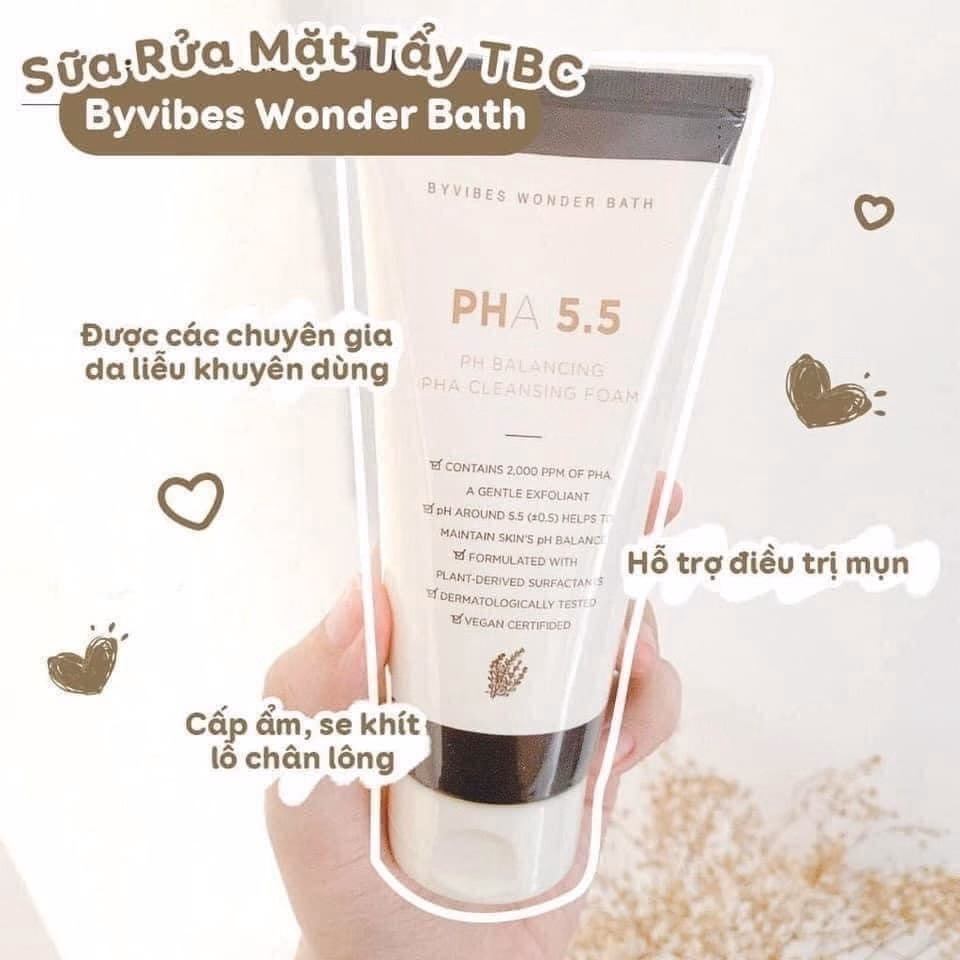 Sữa Rửa Mặt Byvibes Wonder Bath Ph Balancing Pha Cleansing Foam Hàn Quốc là dạng sữa rửa mặt tạo bọt có độ Ph 5.5 và chứa thành phần Pha giúp làm sạch da, ngăn ngừa mụn và hỗ trợ điều trị mụn hiệu quả. Bên cạnh đó, sản phẩm còn chứa thành phần tự nhiên dịu nhẹ cho da nên không làm khô da mà còn giúp giữ ẩm cho da được các chuyên gia da liễu khuyên dùng.
