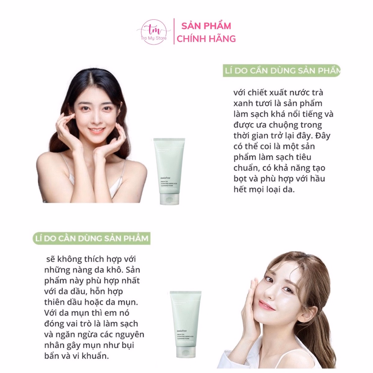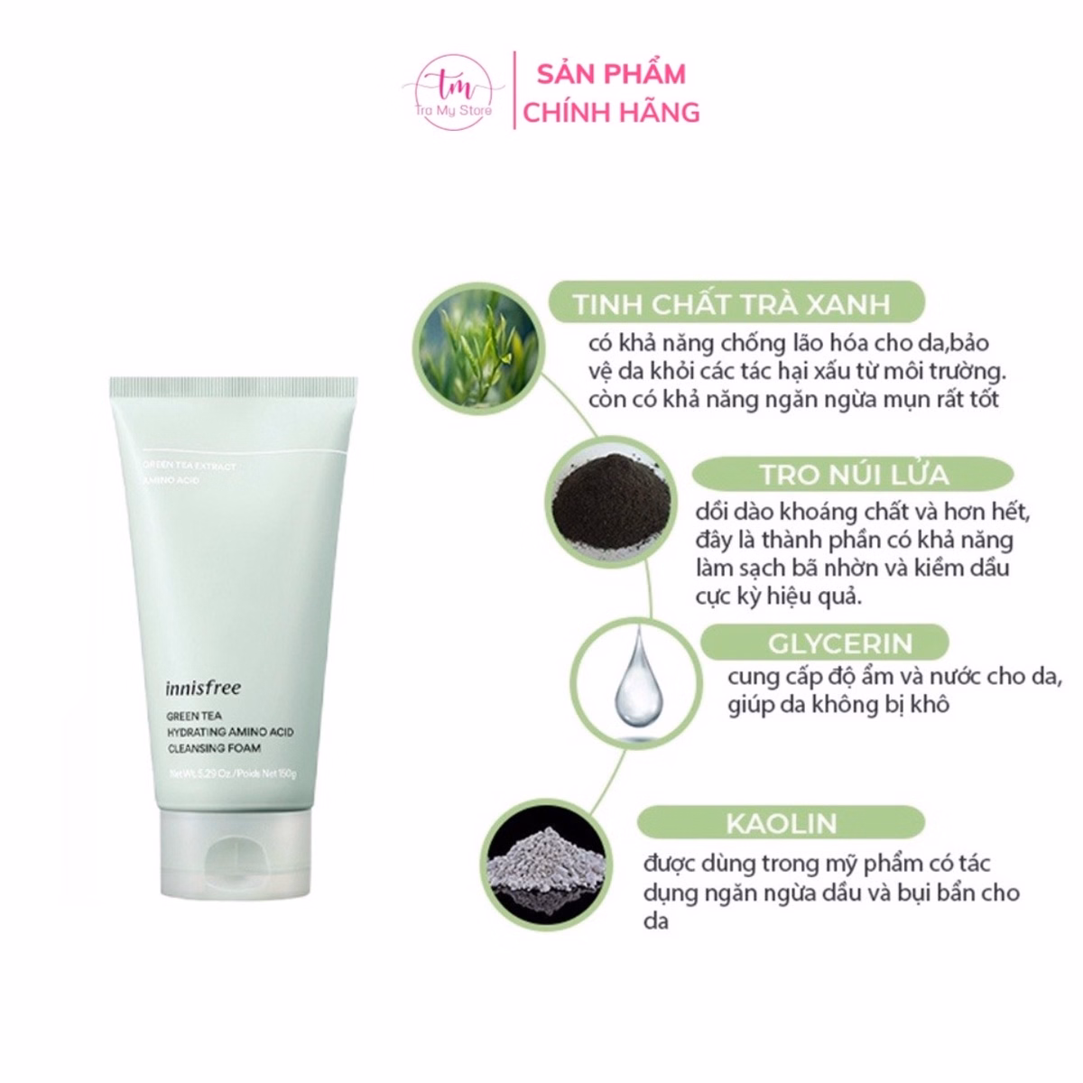 Sữa rửa mặt Innisfree trà xanh có tác động dịu nhẹ nhưng giúp làm sạch, loại bỏ cặn bẩn và vi khuẩn hiệu quả. Thành phần bao gồm 88% chiết xuất lá trà xanh tự nhiên nguyên chất, giàu độ ẩm và các thành phần chống oxy hóa, sữa rửa mặt trà xanh sẽ giúp làn da luôn mềm mại và căng mịn.