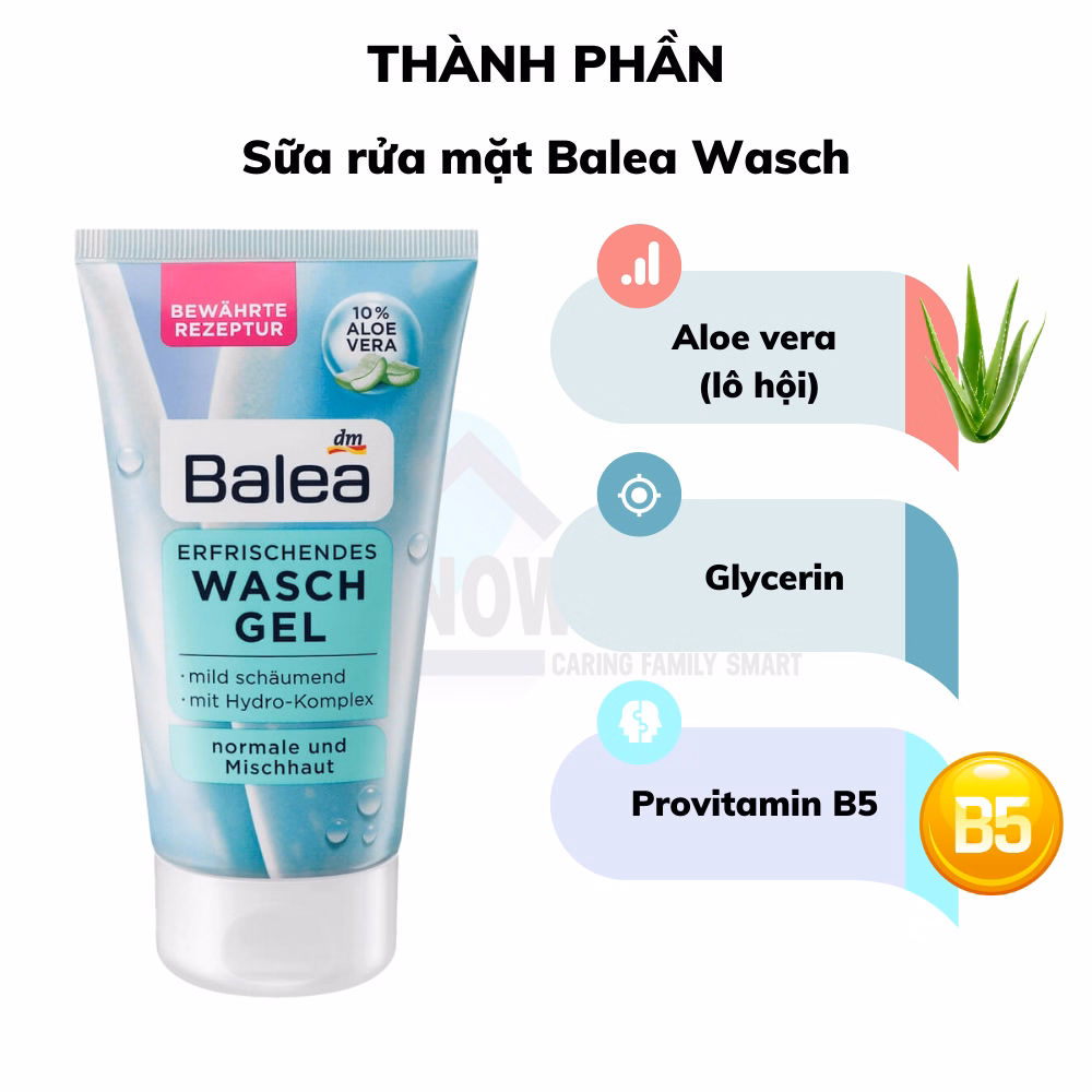 Thành phần sữa rửa mặt Balea lô hội: Aqua, Sodium Laureth Sulfate, Glycerin, Cocamidopropyl Betaine, Isostearamide Mipa, Aloe Barbadensis Leaf Juice, Sodium Chloride, Panthenol, Coco – Glucoside, Sodium Benzoate, Citric Acid, Parfum, Glyceryl Laurate, Potassium Sorbate, Hexyl Cinnamal