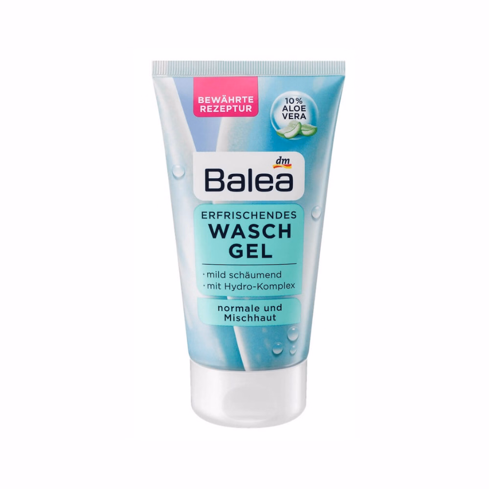 Sữa rửa mặt Balea Wasch Gel – xanh ngọc: với chiết xuất lô hội cùng công thức tạo bọt nhẹ. Giúp làm sạch dễ dàng và loại bỏ bụi bẩn, lớp trang điểm trên da.