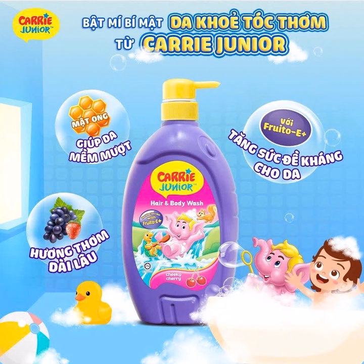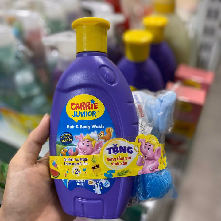 – Sữa Tắm Gội Toàn Thân Carrie Junior với công thức đặt biệt chứa chiết xuất từ sữa bò tươi nguyên chất và sữa đậu nành thiên nhiên nhẹ nhàng làm sạch tóc, da đầu và toàn thân.