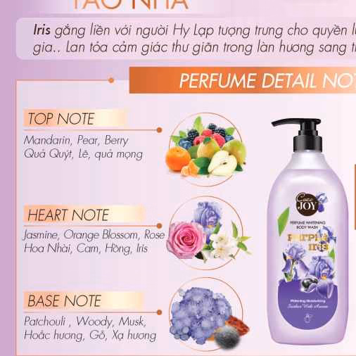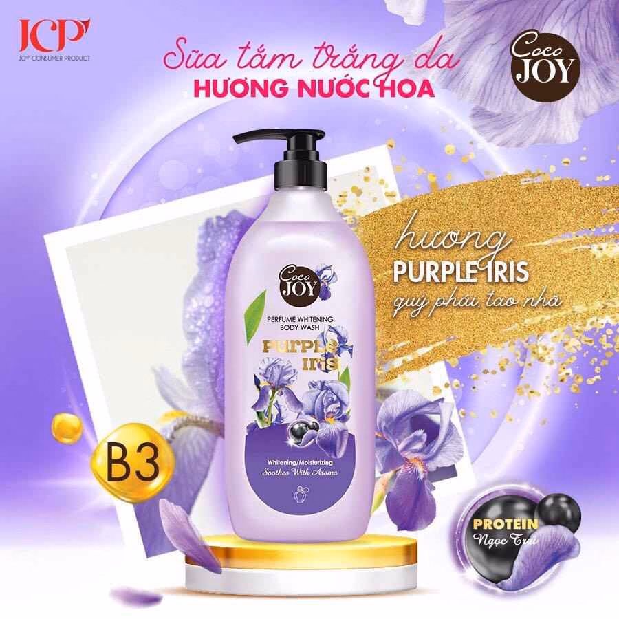 Sữa tắm Coco Joy hương hoa Iris với chiết xuất bột ngọc trai nuôi dưỡng cho làn da sáng mịn rạng ngời kết hợp với Vitamin B3 dưỡng ẩm tuyệt vời và bảo vệ da khỏi tác hại của tia Uv.