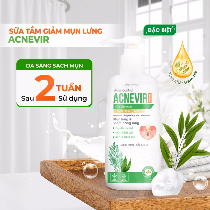Sữa tắm mụn acnevir với các thành phần từ thiên nhiên như tinh đầu tràm trà, dịch chiết là xoài, dịch chiết keo ong,… an toàn dịu nhẹ với làn da. Giúp ngăn ngừa và lại bỏ mụn lưng trả lại một làn da sáng mịn màng. Đặc biệt sữa tắm mụn Acnevir phù hợp với mọi loại da, nhất là da mụn và viêm nang lông.