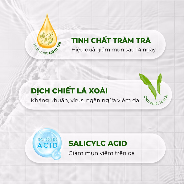 Keo ong, tràm trà, lá xoài, cam thảo, vitamin E, salicylic acid…
