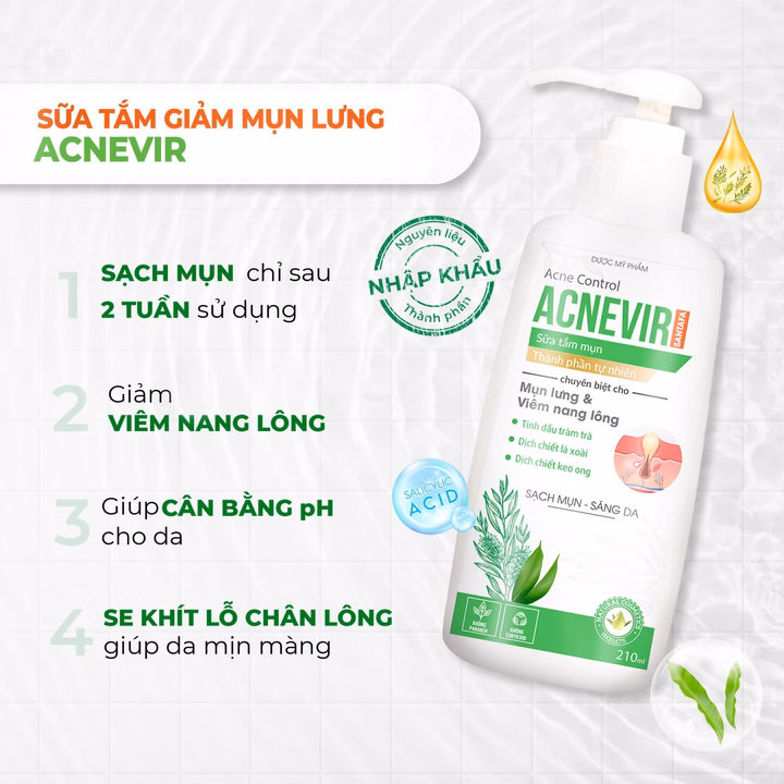Sữa Tắm Mụn Lưng Acnevir Giúp Giảm Viêm Nang Lông, Làm Sạch, Giúp Trắng Da Chai 210Ml – Santafa