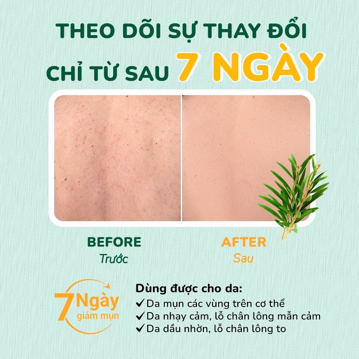 – Làm dịu các nốt mụn, giảm mụn và ngăn ngừa sự phát triển mụn vùng lưng, mông, cơ thể.