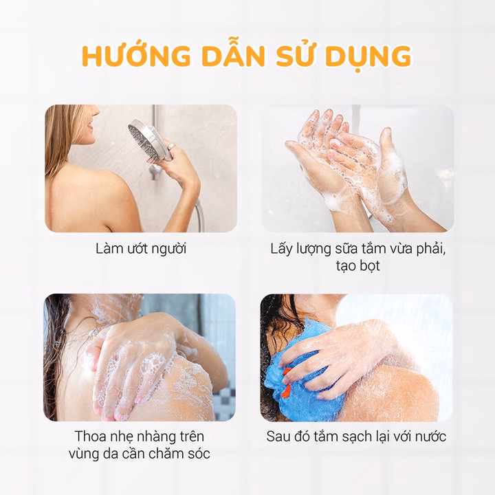 – Bước 1: Làm ướt cơ thể, tạo bọt xoa đều sữa tắm mát xa làm sạch lên toàn thân, đặc biệt vùng đang mụn, viêm lỗ chân lông, vùng da ngứa hoặc nhờn thừa nhiều.