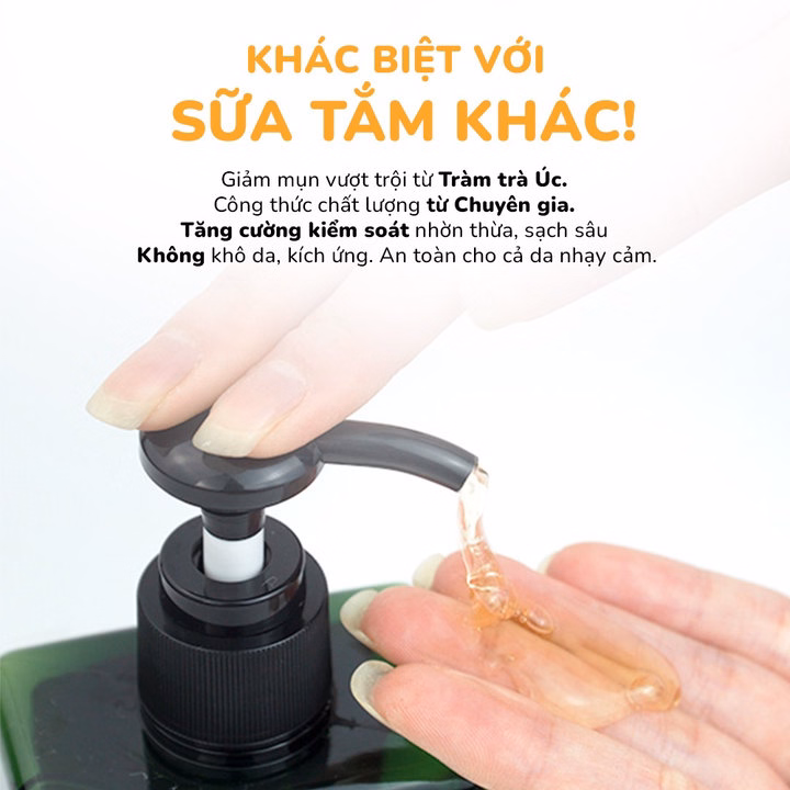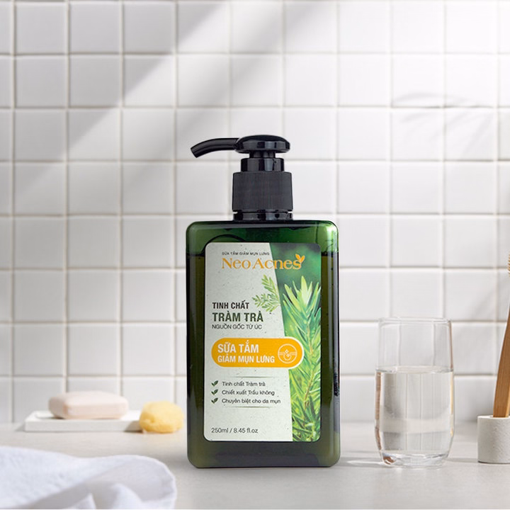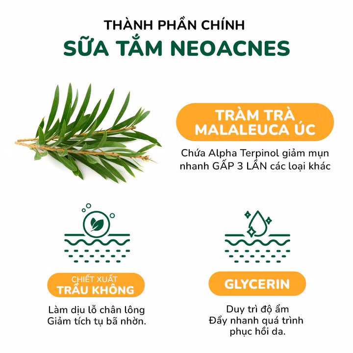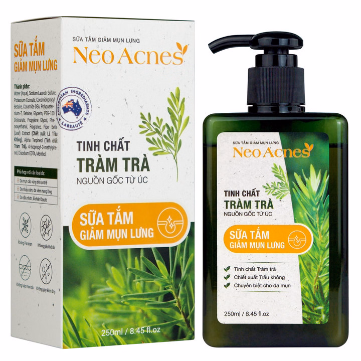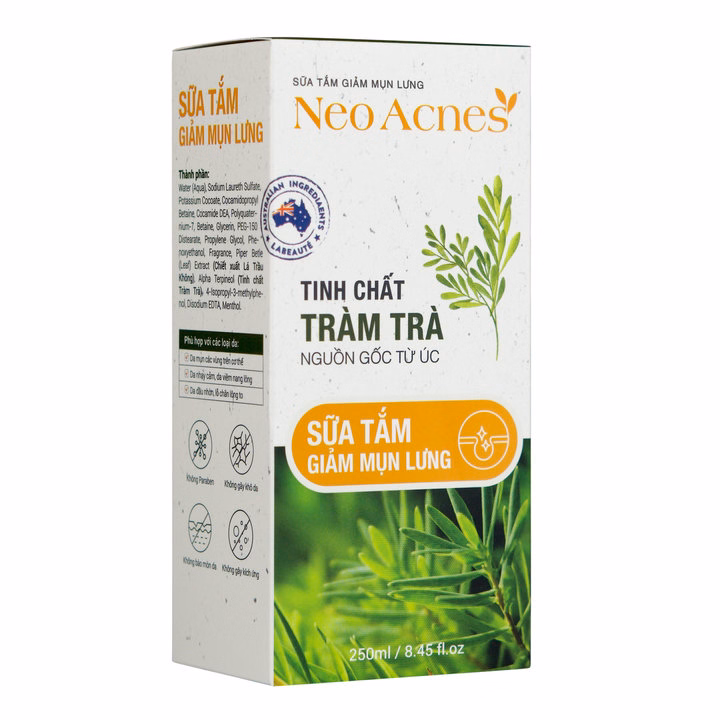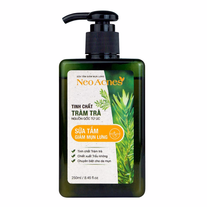 Sữa tắm giảm mụn lưng thiên nhiên Neo Acnes chứa Tinh chất tràm trà từ cây Tràm Trà có nguồn gốc từ Tràm Trà Melaleuca Alternifolia Úc, sở hữu tính kháng khuẩn tự nhiên rất tốt, có thể làm khô và se còi mụn mụn sưng, mụn trứng cá nhanh gấp 3 lần các loại khác. Neoacnes là giải pháp chăm sóc da mụn body, da viêm lỗ chân lông một cách an toàn và lành tính.
