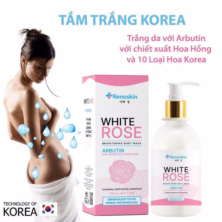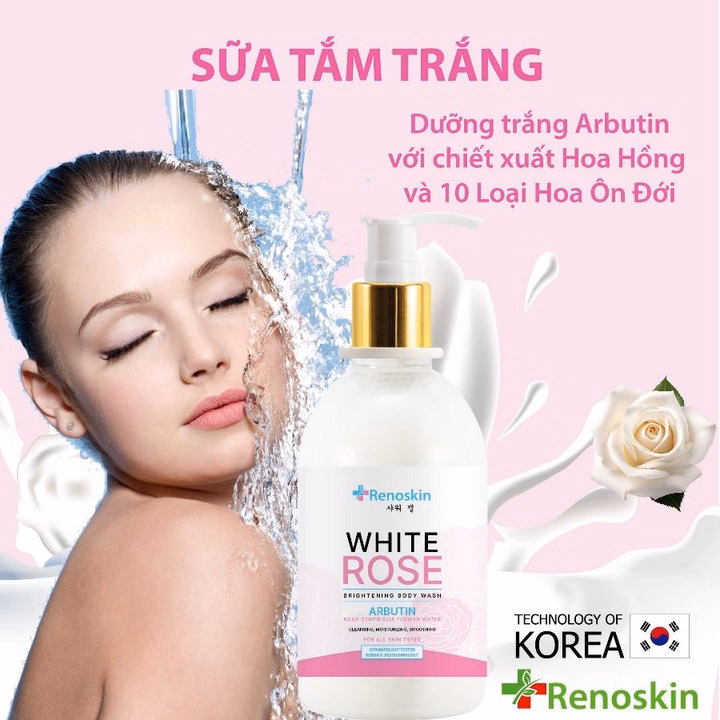 Sữa tắm trắng Hoa Hồng White Rose Renoskin với hoạt chất Arbutin chiết xuất Hoa Hồng và 10 loại hoa Hàn Quốc giúp làn da trắng sáng, mịn màng cũng như quyến rũ với hương Hoa Hồng.