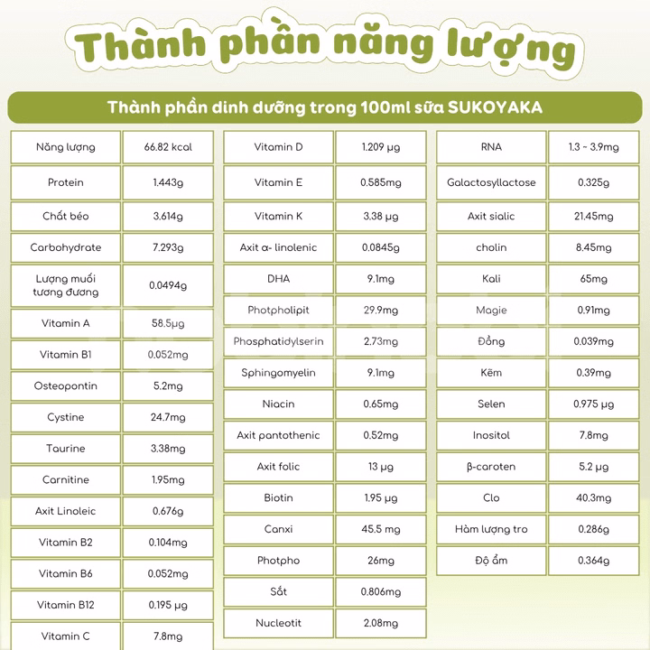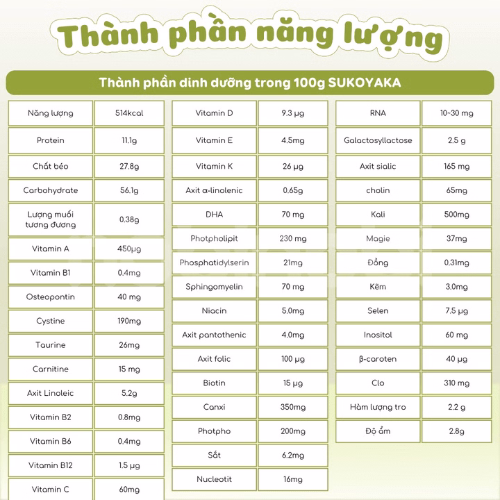 Thành phần dinh dưỡng có trong 100g Sukoyaka: năng lượng 514 kcal