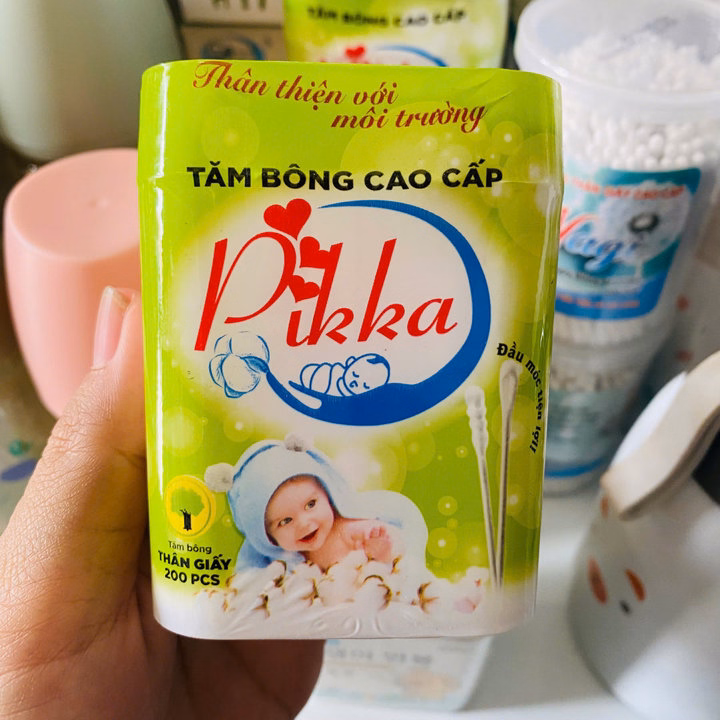 Tăm bông trẻ em Pikka hộp 200 que làm từ bông tự nhiên, an toàn tuyệt đối cho bé L073
