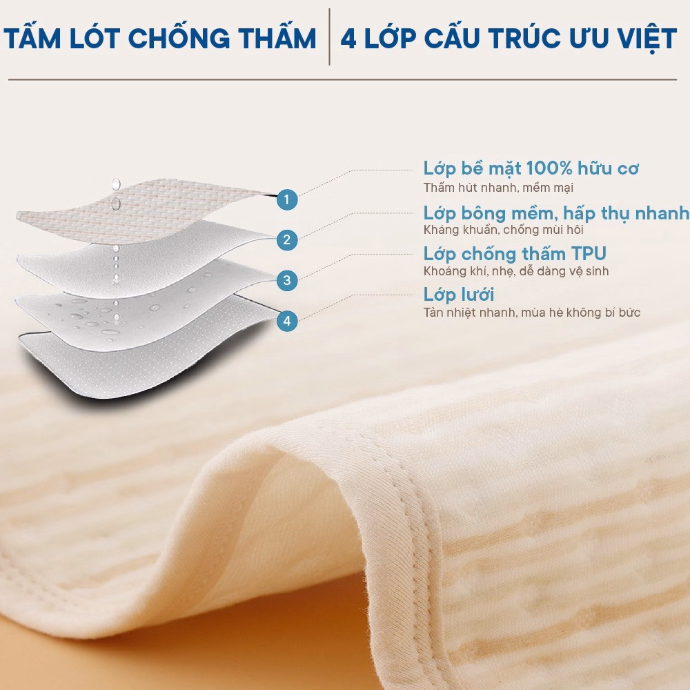 – Tấm lót chống thấm với 4 lớp, lớp trên cùng bằng cotton hữu cơ tư nhiên 100%. rất mềm mại.