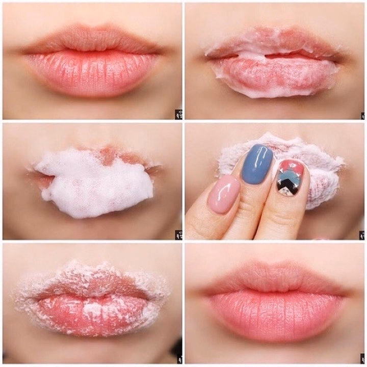 Dùng nước hoặc khăn ướt lau sạch vụn dơ còn sót trên môi.