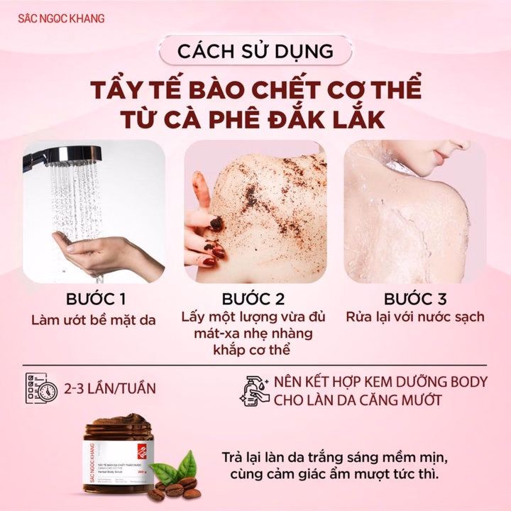 – Trước khi tẩy tế bào chết, có thể sử dụng Sữa Tắm Sắc Ngọc Khang để làm sạch da toàn thân.