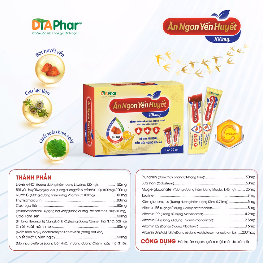Thành phần: L-Lysine Hcl, bột yến huyết, Nutra C, Thymomodulin, cao lạc tiên (dạng bột khô), cao tâm sen (dạng bột khô), cao men bia (dạng bột khô), chiết xuất chùm ngây (dạng bột khô), Pluriamin (đạm thủy phân từ nhộng tằm), sữa non (Colostrum), Magie gluconate, Taurine, Kẽm gluconate, Vitamin B5, Vitamin Pp, Vitamin B1, Vitamin B2, Vitamin B9