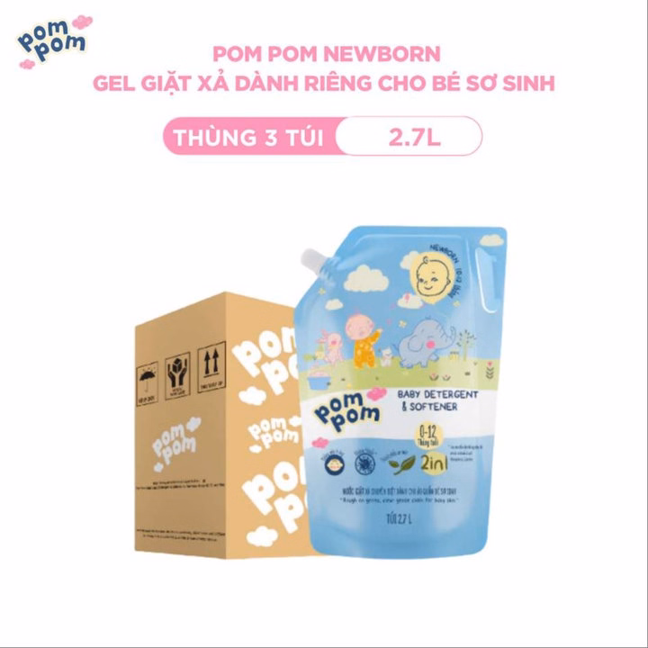 [Thùng 3 Túi] Gel Giặt Xả Đậm Đặc 2in1 Pompom Newborn Chuyên Dùng Cho Bé Sơ Sinh Sạch Sâu – Kháng Khuẩn – Khử Mùi Nôn Trớ, Ọc Sữa, Tè Khai-Lưu Hương Phấn Thơm Dịu Nhẹ – Túi 2.7L