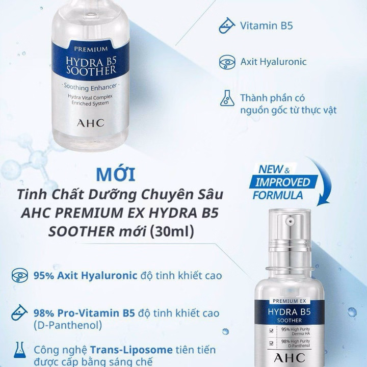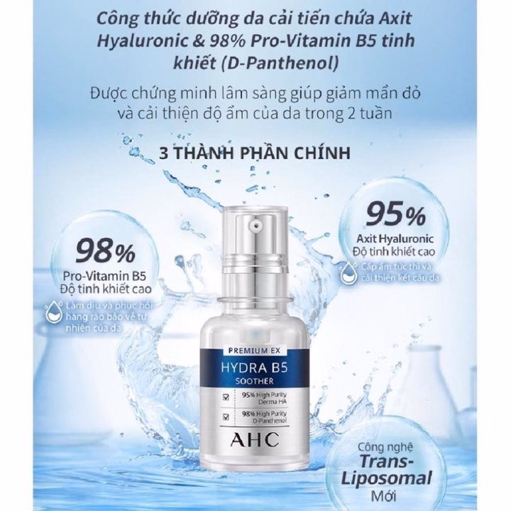 Serum Ahc cũng chứa lượng cao vitamin B5 giúp làm dịu làn da nhạy cảm, đặc biệt là phần màu đỏ rát, nhạy cảm do trong thay đổi theo mùa và không khí ô nhiễm.