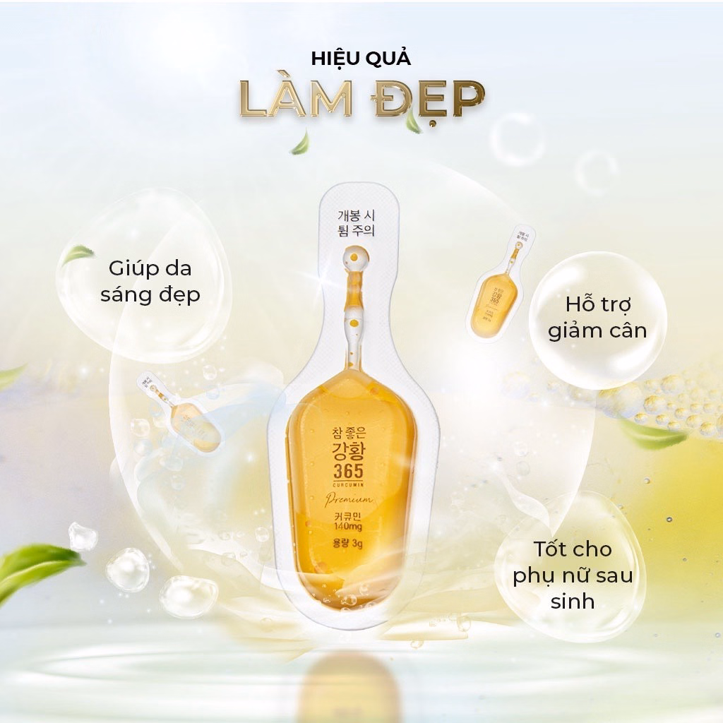 Nano Curcumin 365 Premium là sản phẩm được nhập khẩu chính ngạch từ Hàn Quốc. Sản phẩm chiết xuất curcumin được tổng hợp bằng công nghệ nano dưới dạng các phân tử siêu nhỏ, nhờ đó làm tăng khả năng hấp thụ hoạt chất curcumin vào cơ thể. Sản phẩm không mùi, không vị, dễ dàng hòa tan trong nước, đồ uống, phù hợp với mọi đối tượng, đặc biệt cho phụ nữ sau sinh, người có chức năng dạ dày và gan yếu, người muốn làm đẹp da.