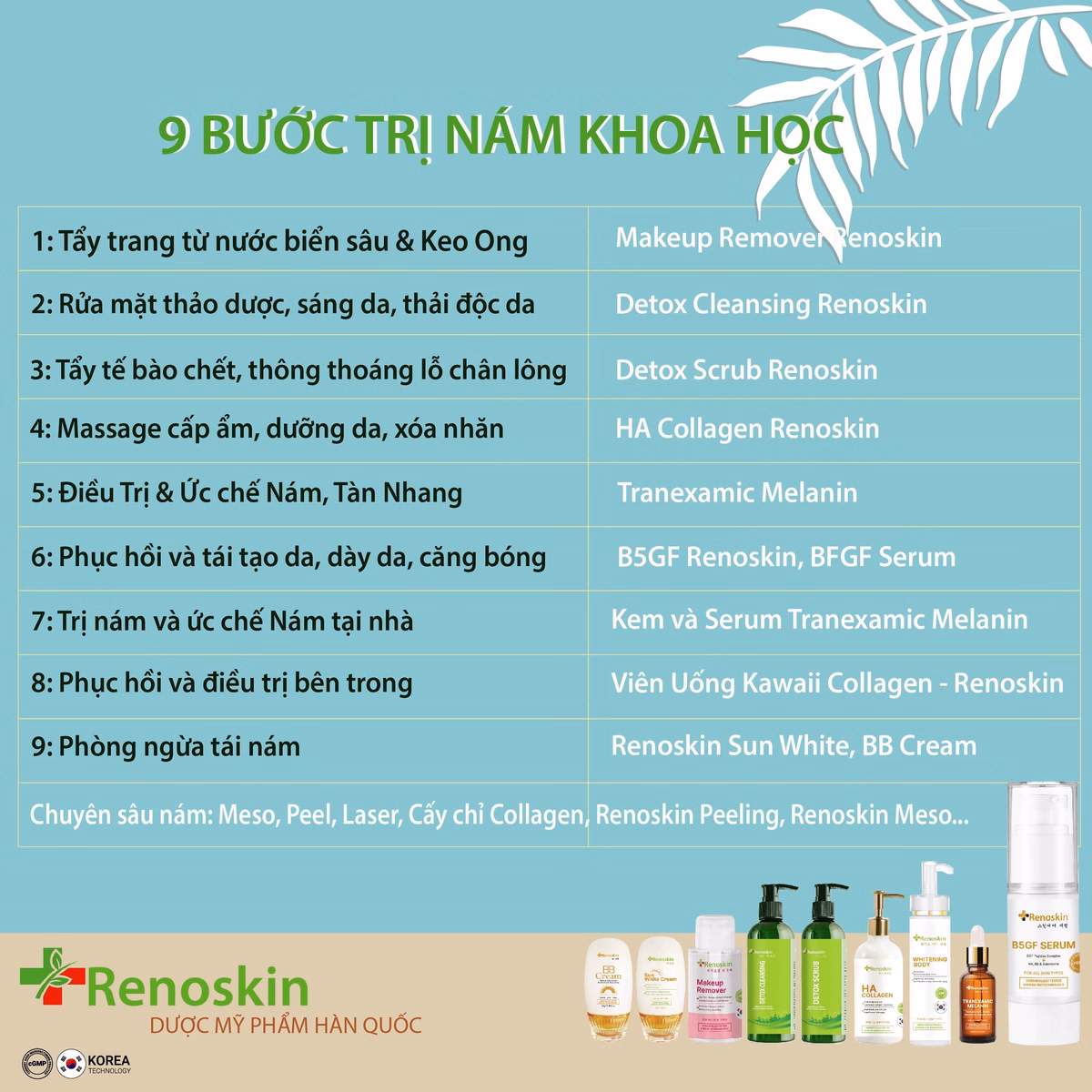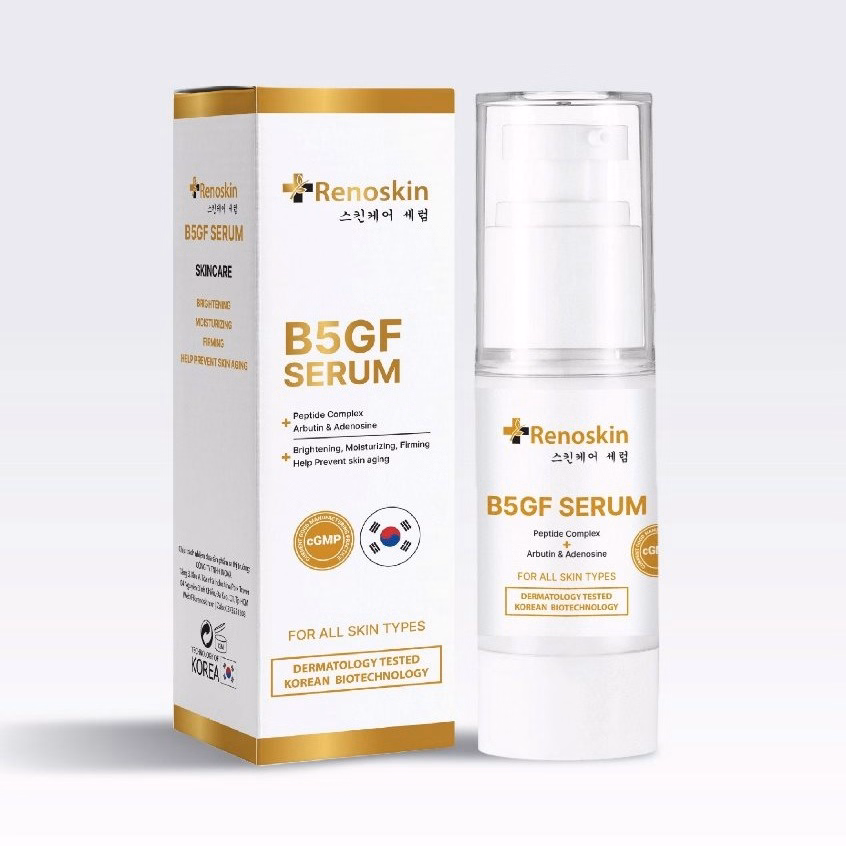 Renoskin B5gf chứa các yếu tố tăng trưởng, tế bào gốc Stemcell: Egf, Fgf, Igf, Vegf Peptide các vitamin và dưỡng chất nuôi dưỡng và ức chế thâm và sạm da như Vitamin B5, Niacinamide, Arbutin, Allantoin, Adenosine, Ha…