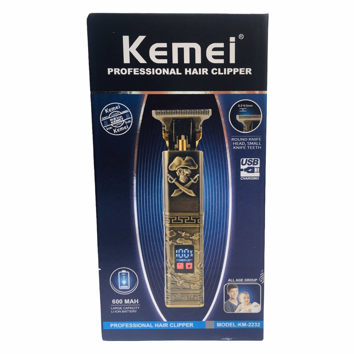Tông đơ Kemei Km-2232 có lưỡi thép và carbon hình chữ T, được sản xuất theo công nghệ mới nhất. Kimi 2232 có trọng lượng 170 gram, được coi là một trong những loại nhẹ nhất trong số các loại Máy cắt cỏ, đồng thời nhẹ nhàng, mạnh mẽ, tốc độ và hình thức đẹp, tất cả những đặc điểm tốt của một chiếc tông đơ đều có thể tìm thấy ở Kimi 2232. có màn hình Lcd và pin lithium 600 Mah. Bộ sản phẩm gồm 8 chiếc, bao gồm lót, 3 lược cạo với các số 1-2-3mm, cáp sạc Usb, bàn chải làm sạch, nắp bảo vệ và dầu bôi trơn. Vì vậy, sử dụng lược, nó có thể được cắt 0-3 mm, phù hợp để tạo bóng. Dao cạo là hình vuông,