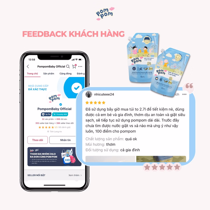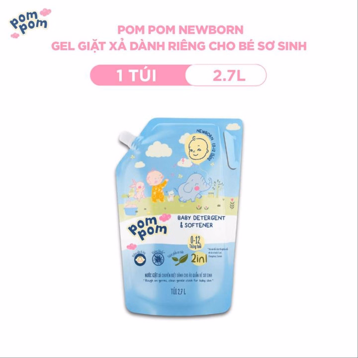 Gel Giặt Xả Đậm Đặc 2in1 Pompom Newborn Chuyên Dùng Cho Bé Sơ Sinh Sạch Sâu – Kháng Khuẩn – Khử Mùi Nôn Trớ, Ọc Sữa, Tè Khai-Lưu Hương Phấn Thơm Dịu Nhẹ – Túi 2.7L
