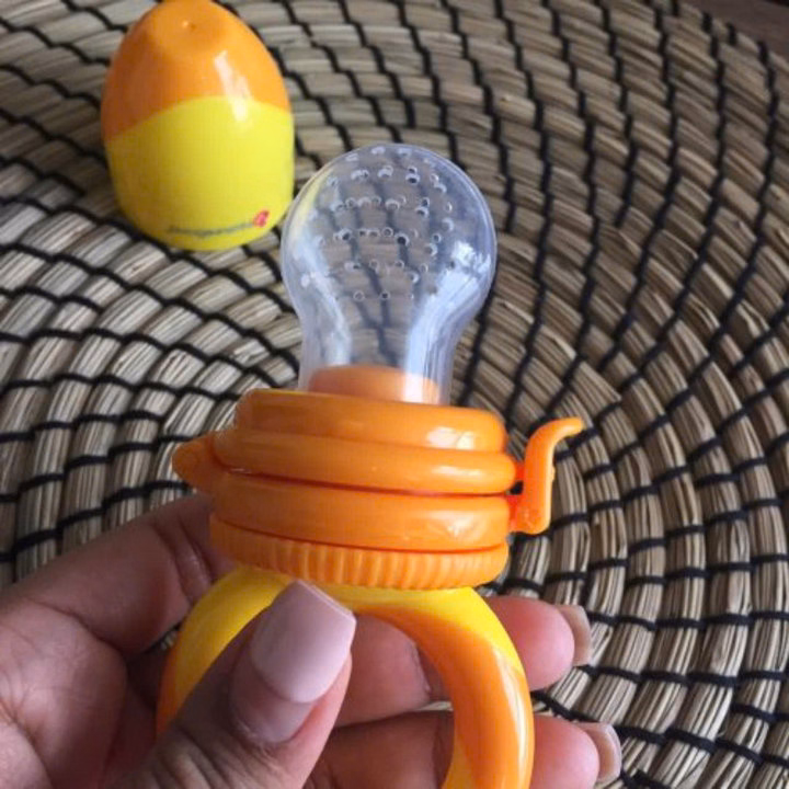 ➡️ Chỉ cần cho thức ăn (hoa quả hoặc rau củ quả đã hấp mềm) vào trong túi nhai silicon an toàn và chắc chắn sau đó đóng lại rồi khóa chốt