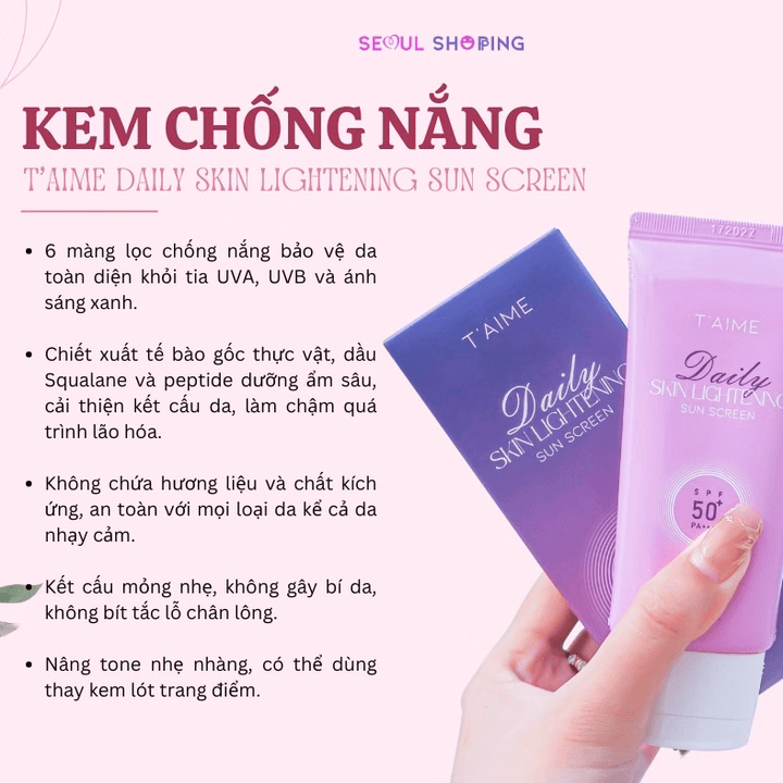 Xin chào những khách hàng xinh đẹp của Seoul Shopping! Mùa hè đang đến và ánh nắng mặt trời không chỉ mang lại niềm vui mà còn tiềm ẩn nhiều nguy cơ gây hại cho làn da của chúng ta. Nhưng đừng lo, T’aime Daily Skin Lightening Sun Screen đã sẵn sàng để bảo vệ bạn khỏi những tác động tiêu cực đó!