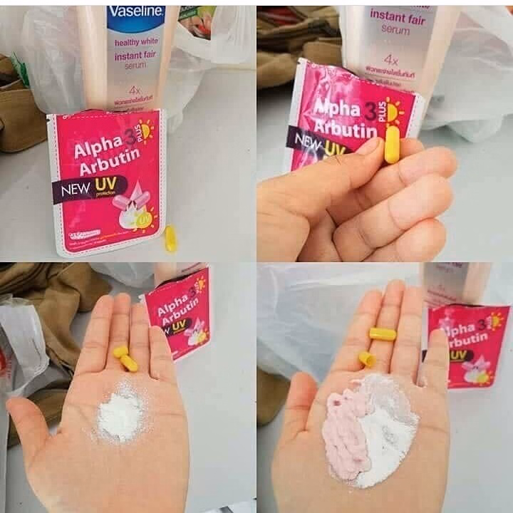 Hdsd: lấy 1 lượng nhỏ lotion (kem/ sữa dưỡng thể) dùng trong 2-3 ngày ra 1 lọ nhỏ sạch sẽ, rồi tách 1 viên alpha arbutin ra và trộn đều. Sau đó thoa sáng tối như lotion bình thường
