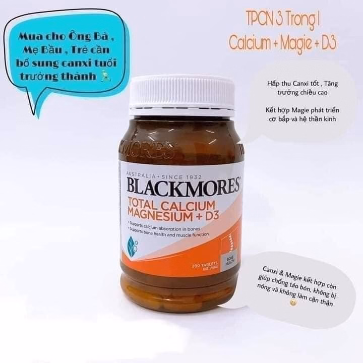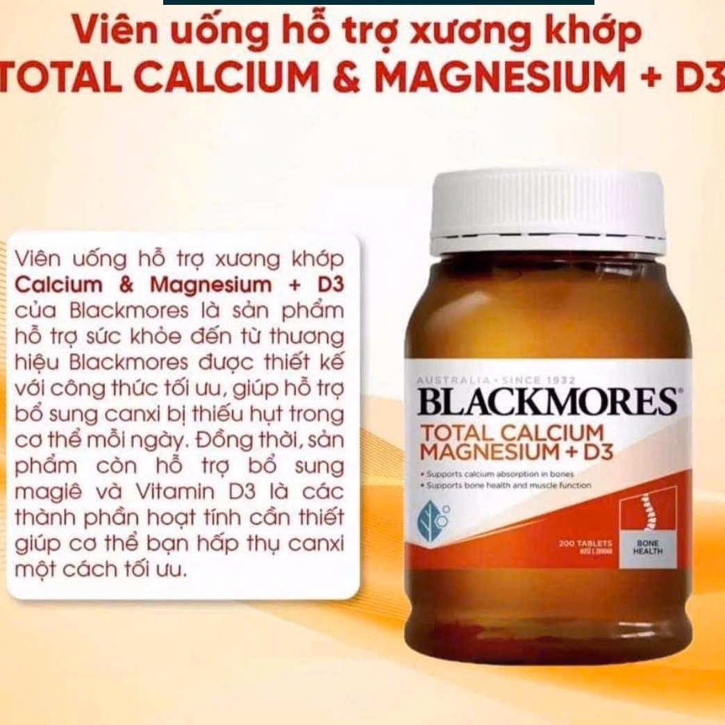 Blackmores Total Calcium & magnesium + d3 200 tablets bổ sung canxi, magie và D3 với hàm lượng lý tưởng, bên cạnh đó các dưỡng chất giúp tăng cường hấp thu canxi vào cơ thể.